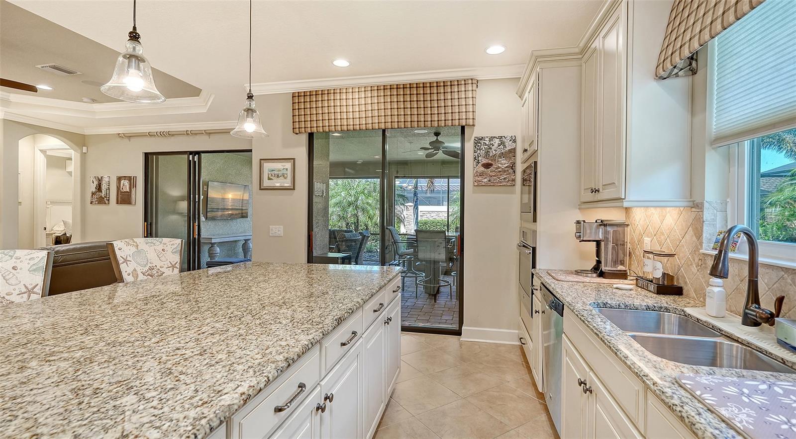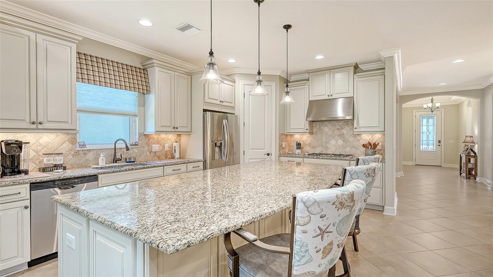 Experience refined living in this lightly lived-in and impeccably maintained three-bedroom, three-bath residence, ideally in sought-after Esplanade Golf & Country Club. Offered well below its 2023 purchase price, this home presents an exceptional opportunity and outstanding value. Designed with comfort, security and peace of mind, it stands apart with Category 5 hurricane-rated windows, a whole-house generator connected to natural gas, a front storm door, roll-down hurricane shutters, a drainage improvement system, water treatment and enhanced smoke detection. Every detail reflects meticulous care and pride of ownership. The thoughtfully designed Lazio floor plan strikes a balance between everyday ease and effortless entertaining, blending open gathering spaces with private retreats. The chef-inspired kitchen boasts a spacious gleaming island, deep-volume cabinetry with pull-out drawers, a bright window over the sink, three designer pendant lights and a walk-in corner pantry, ideal for hosting guests or enjoying casual family meals. The primary suite serves as a serene retreat, featuring a custom-built walk-in closet complete with drawers, jewelry storage and a secure floor-mounted safe. Two additional bedrooms, each with their own private bath, plus a versatile den or office, offer comfort and flexibility for any lifestyle. Additional features include recessed lighting throughout, a newer HVAC system and a mini-split air-conditioning unit for personalized climate control in the primary suite. Go outside to the extended, covered and screened lanai, an inviting outdoor living space designed for year-round enjoyment. Relax at the granite summer kitchen bar, unwind in the hot tub, or take in the lush, landscaped garden wall offering beauty and privacy. Motorized storm and privacy shades provide an extra layer of comfort and security. Discover the pinnacle of resort-style living at Esplanade in Lakewood Ranch, where every day feels like a getaway. This vibrant, amenity-rich community features beautifully landscaped grounds, scenic recreational trails and a world-class array of activities. Residents enjoy access to a championship golf course, full-service spa, tennis and pickleball courts, and an elegant clubhouse offering fine dining and social events. Whether lounging by the resort pool or gathering with friends for a sunset cocktail, Esplanade offers a blend of luxury, leisure and connection in the heart of Lakewood Ranch.